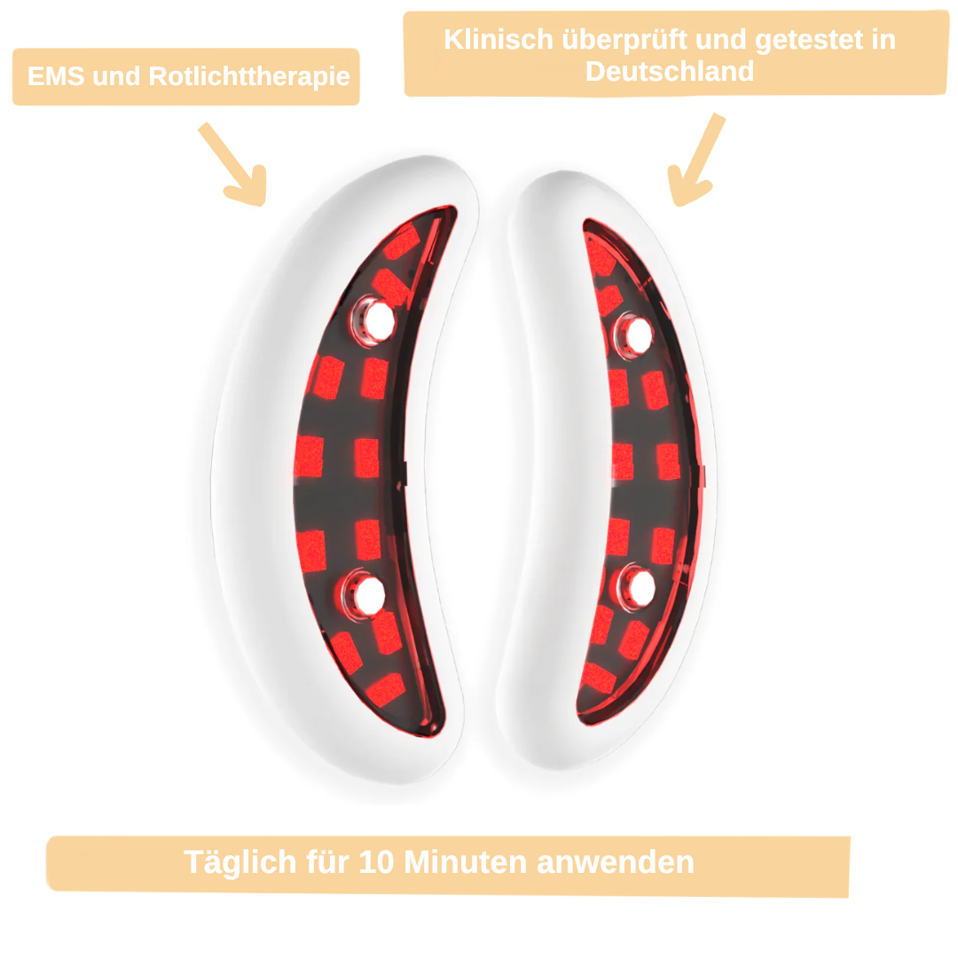 Das Eyesoothe kombiniert EMS (Elektrische Muskelstimulation) und Rotlichttherapie, um müde Augen zu erfrischen und Augenringe zu reduzieren. Klinisch überprüft und in Deutschland getestet, sorgt es für sichtbare Ergebnisse. Wenden Sie es täglich für nur 10 Minuten an und erleben Sie eine deutliche Verbesserung Ihrer Augenpartie. Einfach und effektiv!